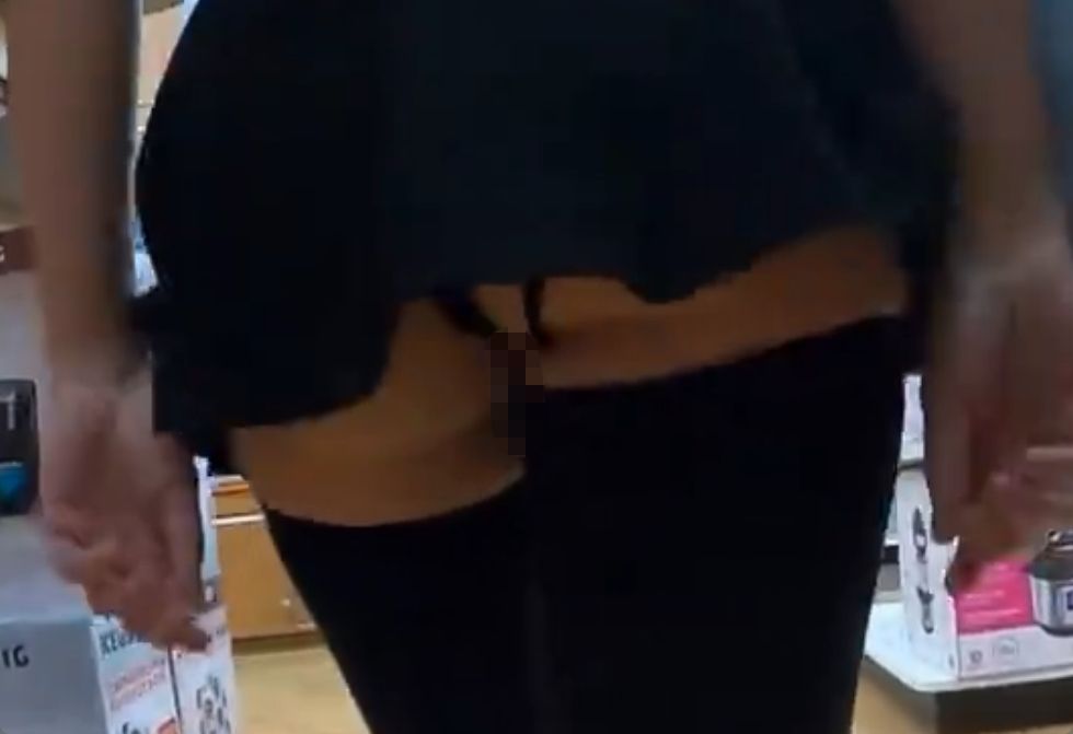 ノーパンミニスカ女が店内でマンコ丸出し露出!パンツなんていらなかったw